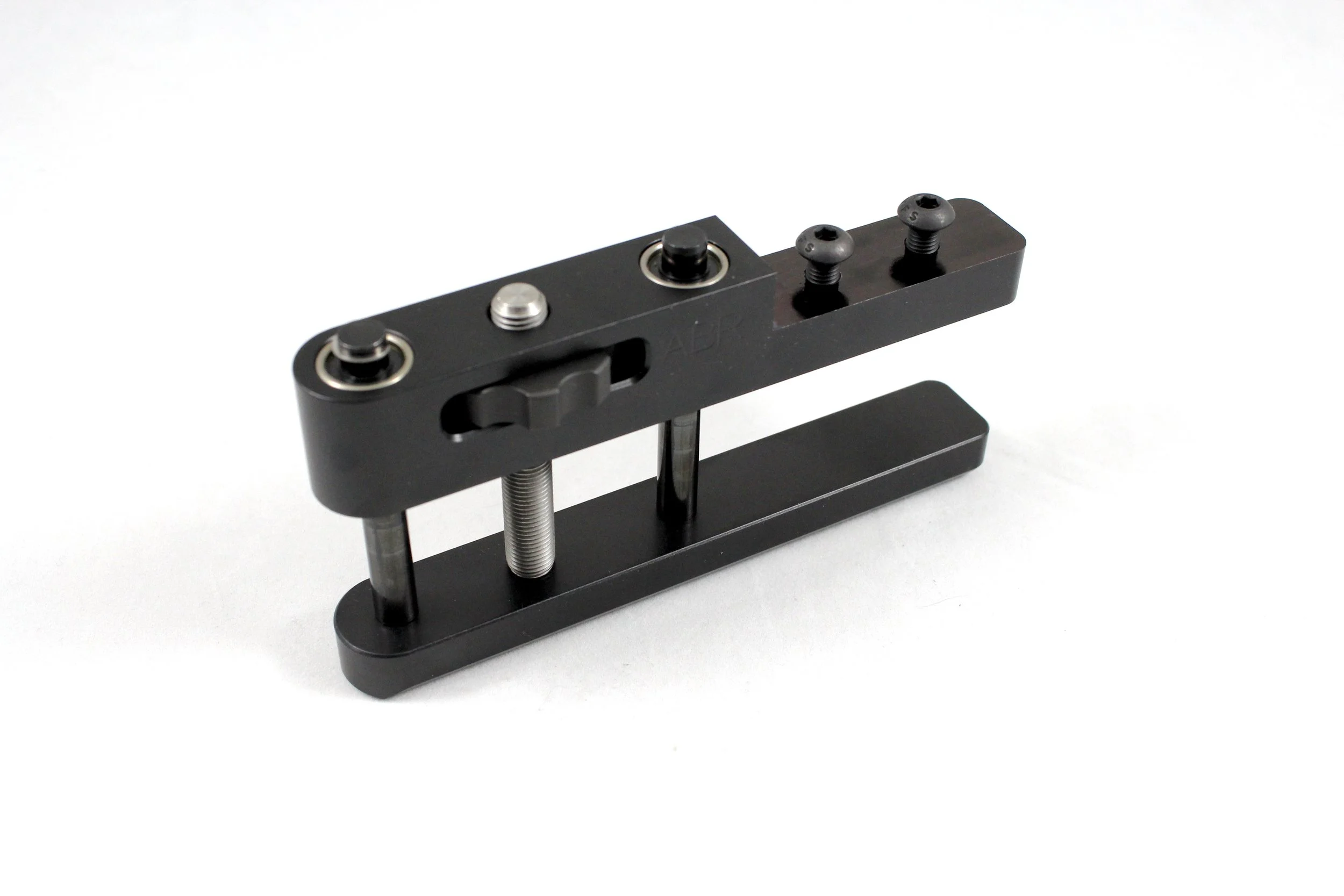 Two lower rider options are available - the V and ELR. The ELR base is .850” wide. The ‘Bag Selection’ page goes over the lower rider differences. The ABR provides rock solid stability, straight tracking and vertical adjustment. The ABRs are CNC machined from USA made 6061 Alum, Anodized Class II Black and weighs 12-14 oz . A 5/32 hex wrench will be needed to install the supplied bolts. The ABR provides about 1.48”.