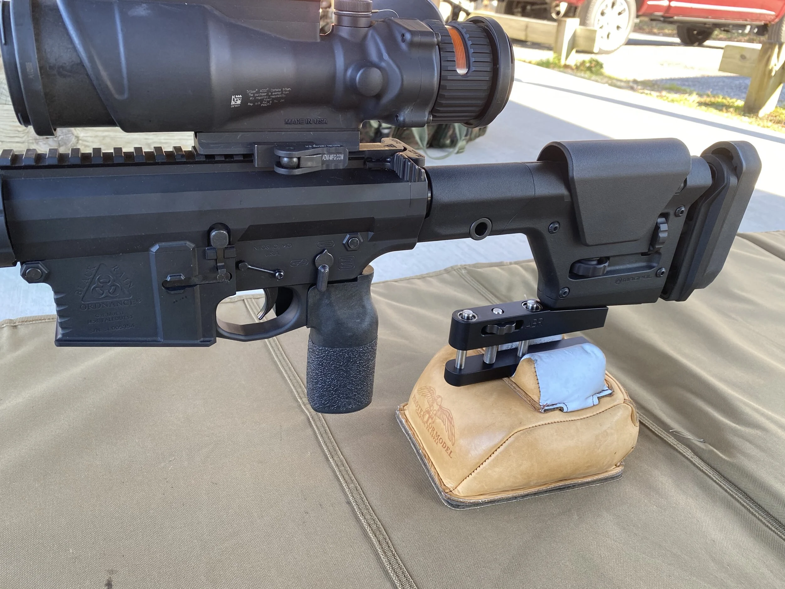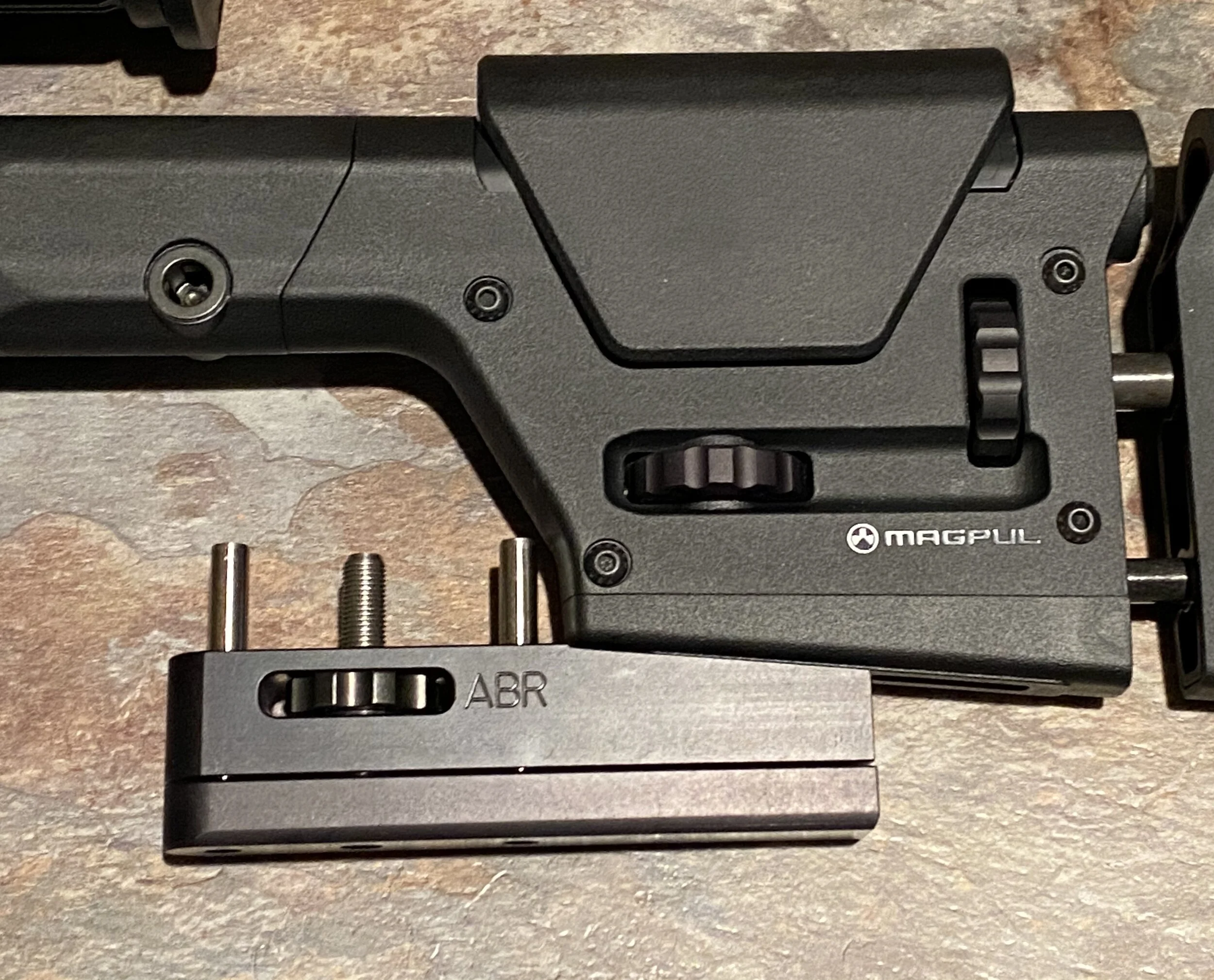 The Patented ABR was designed to fit the - Magpul PRS3 and to mount directly to the stock with supplied bracket and bolts. A ‘vertical grip- like the LSP Vertical Adjustable Grip’ is required as 2”+ clearance is needed between the rear of grip and the front of the ABR (see pic with yellow ruler) . The LONGER of the two tube spacer should be used which increases the LOP. Two lower riders are available and are designed to provide optimal performance when used with a rear bag with ears. It provides the same functionality as the other ABRs. Made in the USA from American 6061 Alum and finished with Class II Anodizing they are less than 14oz. The ‘Bag Selection’ page goes over the lower rider differences. There is a “Link” below that fully explains the installation process and maintenance.